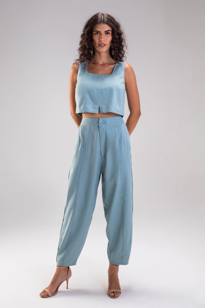 blusa de comprimento cropped, shape regata, decote quadrado, recorte vertical no centro da frente com fenda no final e detalhe de costuras duplas