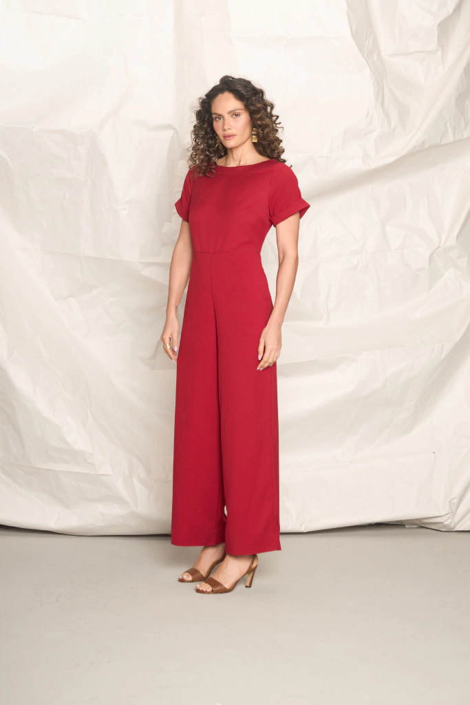 macacão de comprimento longo, shape levemente soltinho, mangas curtas com barra italiana, decote canoa, recorte horizontal na cintura, bolsos faca funcionais nas laterais, abotoamento gota e fechamento realizado por zíper invisível no centro das costas.
