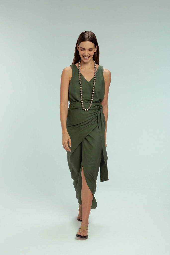 saia de comprimento cropped, shape reto, fechamento tipo envelope, detalhe de pregas na região do cós e faixas longas para amarrações diversas.