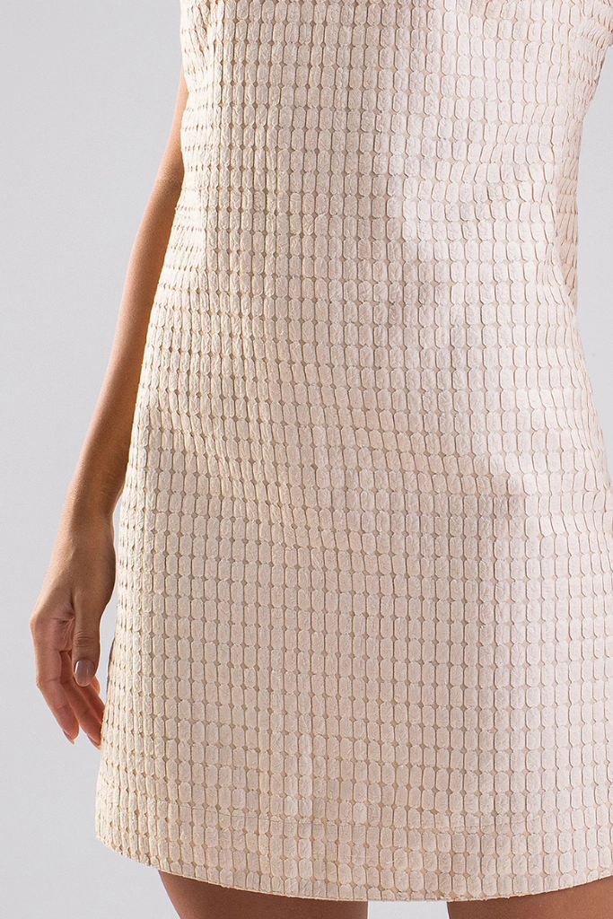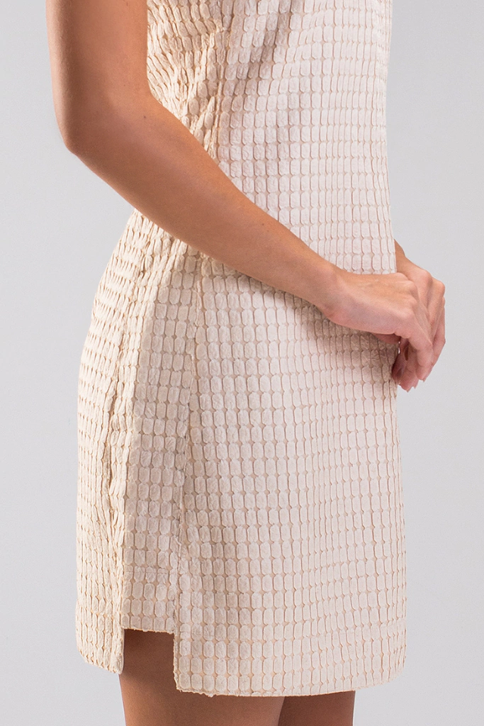 vestido de comprimento curto, sem mangas, decote V e recortes laterais retangulares
