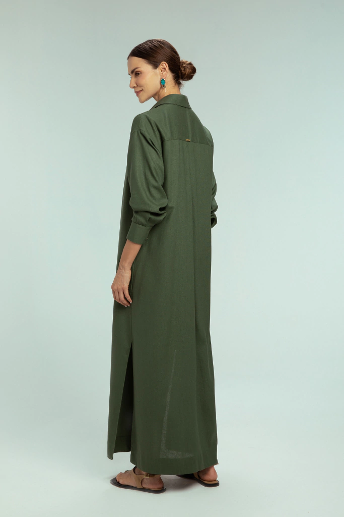 vestido estilo chemise, comprimento cropped, shape amplo, mangas longas, tapeta embutida e recorte horizontal com pala nas costas.